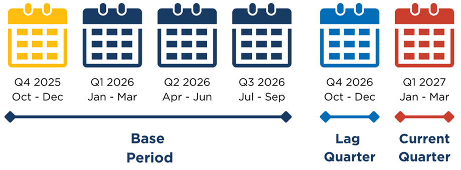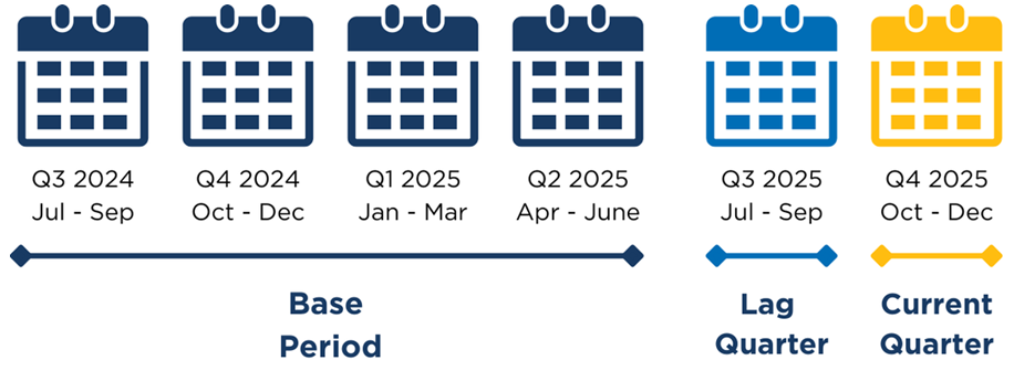 The current calendar quarter (filing quarter) is not used as wages earned during this quarter have not yet been reported to the state. Neither is the most recent prior quarter (lag quarter) as processing of reported wages may still be in progress depending on the claim filing date.